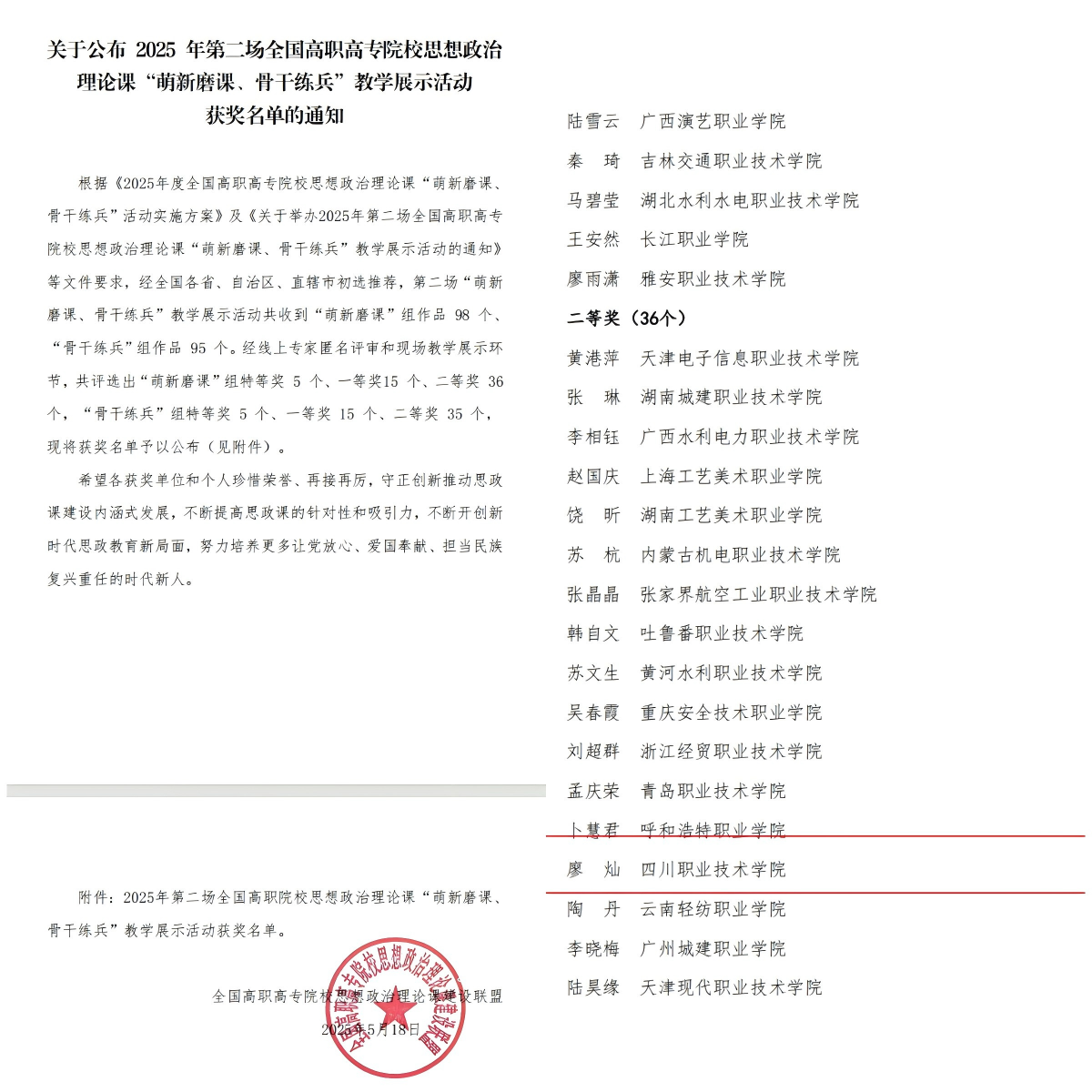 5月17日,2025年全国第二场高职高专院校思想政治理论课“萌新磨课、骨干练兵”教学展示活动在重庆城市管理职业学院成功举办。来自全国24个省、自治区、直辖市的120所院校马院负责人,以及350余位思政课骨干教师和青年教师代表参加活动,我校马克思主义学院青年教师廖灿凭借扎实的教学基本功和出色的专业素养,在本次活动中脱颖而出,荣获“萌新磨课”组二等奖。